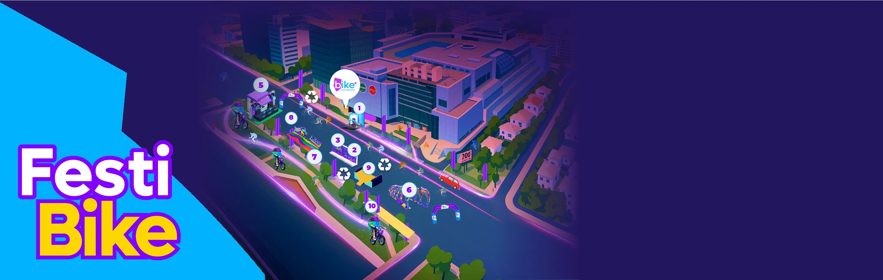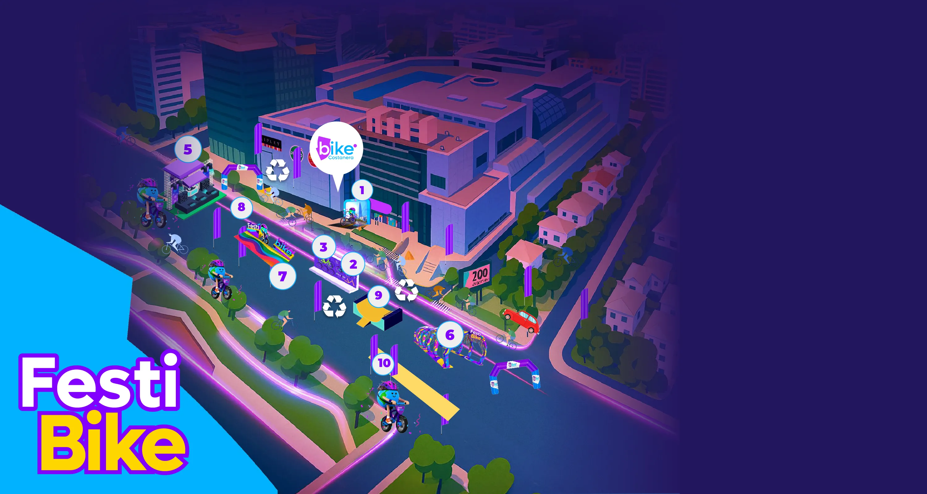 1 STAND INFORMATIVO 2 TALLER BICI 3 ENCHULA TU BICI 4 RECICLAJE 5 STAGE 6 RUTA ARCOIRIS - PHOTO OPP. 7 FESTIBIKE - PHOTO OPP. 8 CARRITOS DE HIDRATACIÓN 9 RAMPA BMX 10 STAND MERCADO EMPRENDE