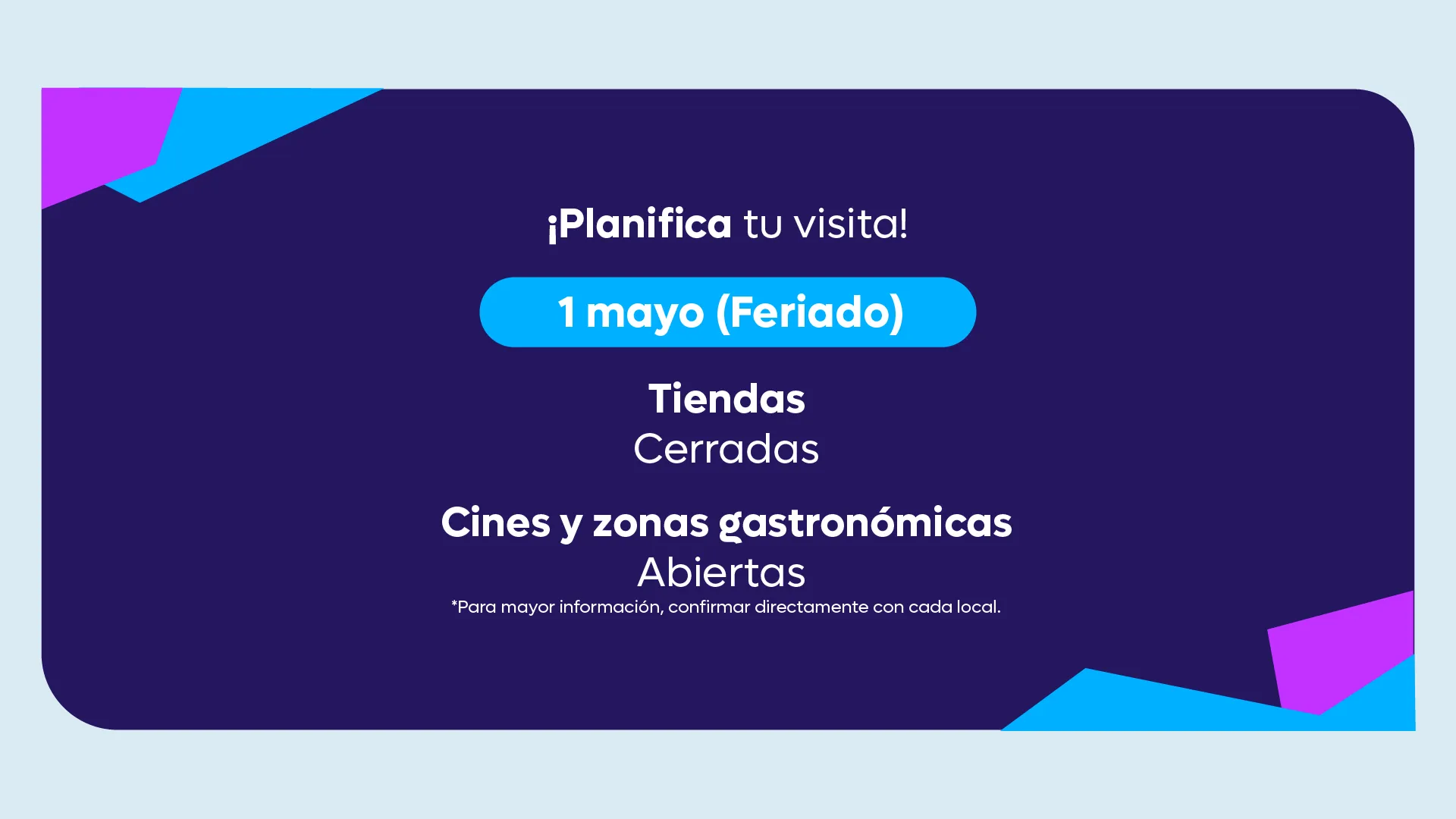 Para mayor información, confirmar directamente en cada local